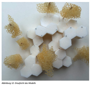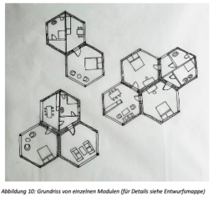 Bauweisen und Gebäuden mit geringem negativem Einfluss auf Böden, Natur und Klima und interviewte eine Stadt- und Raumplanerin. Entwürfe, Skizze, Pläne und ein Modell veranschaulichen die Erkenntnisse aus der Recherche. Ihr Entwurf „Honey Maker“ ist modulares Hexagon auf Stelzen, das variabel verbaut werden kann.