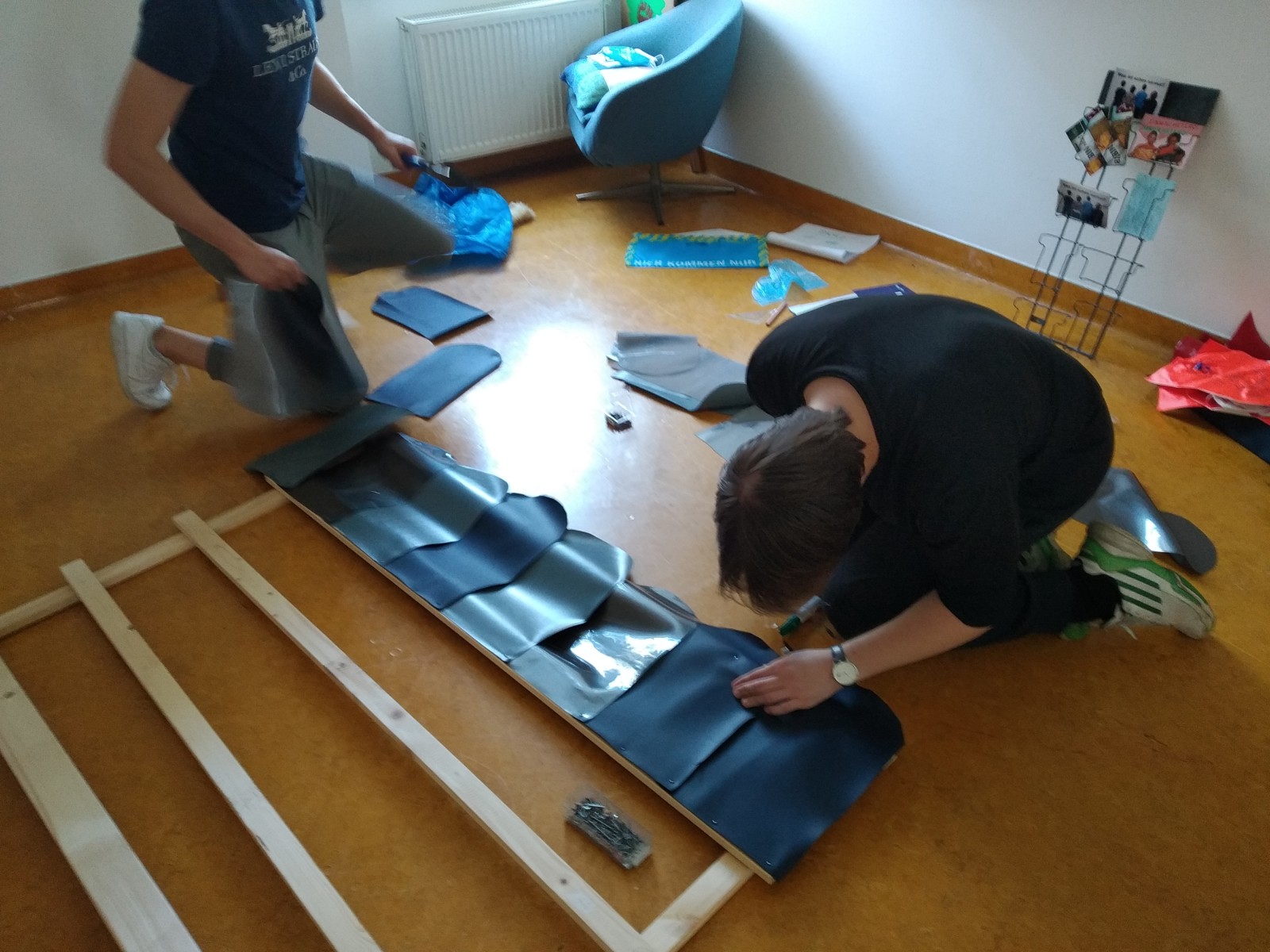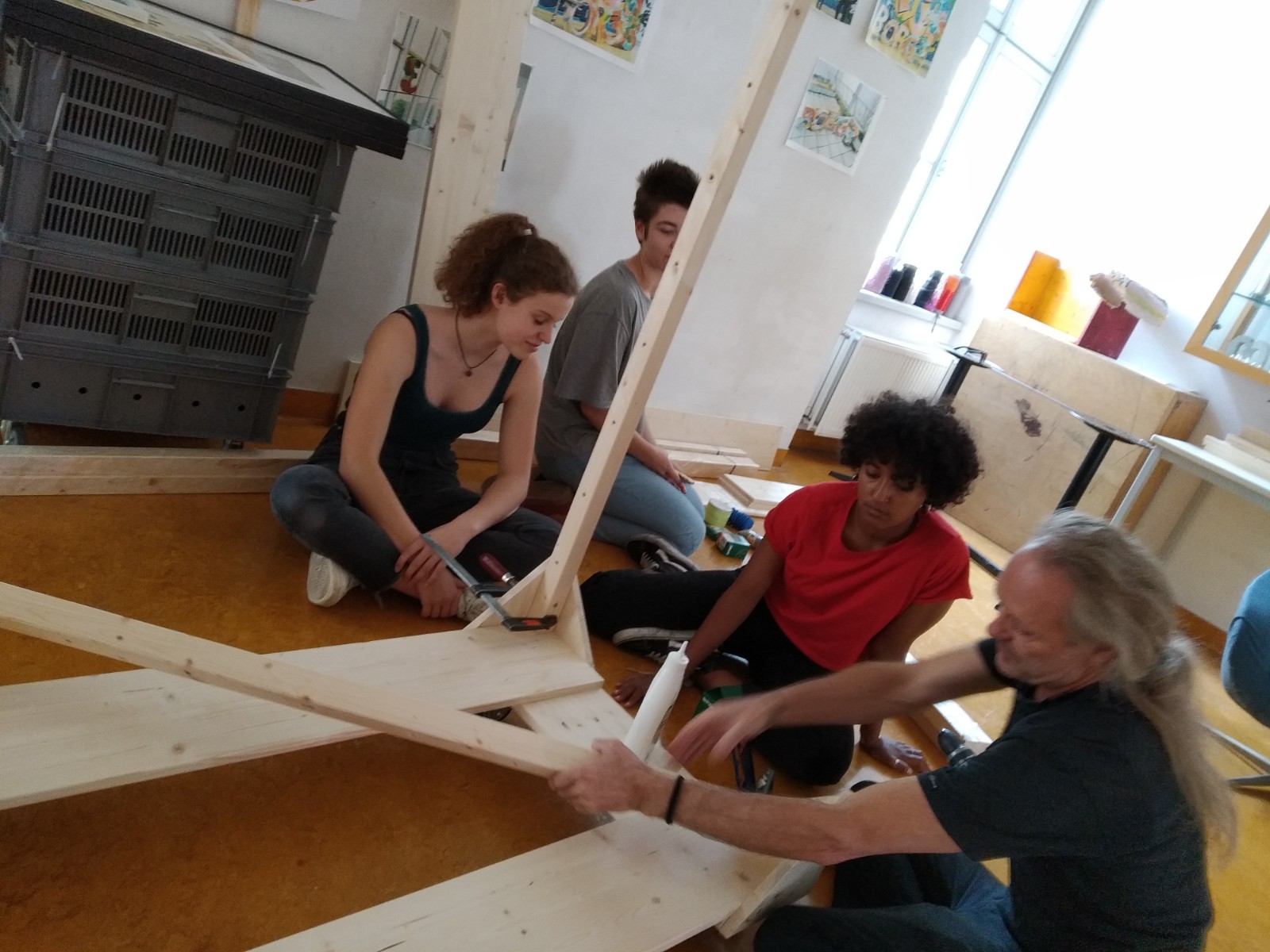 Es wurde am Konzept gefeilt und geplant um natürlich auch realisiert. Funktionale Vorgaben und unsere technischen und zeitlichen Möglichkeiten an das Demo Mobil führten zu einer simplen aber sehr flexibel nutzbaren Umsetzung des fahrbaren Objektes aus einer Konstruktion aus Holzleisten, Brettern, Verspannungen und einem Dach. Je nach Einsatzort oder Event kann das DEMO MOBIL unterschiedlich bespielt und genutzt werden – vom rollbaren Transparente- und Zine-Display bis hin zur Rolldisco oder einem fahrenden Garten. Die Holzkonstruktion ermöglicht in Kombination mit Kabelbindern und Abstellflächen unterschiedlichste Aktionen.