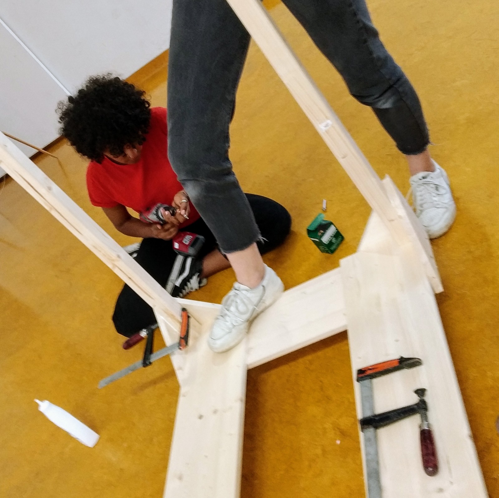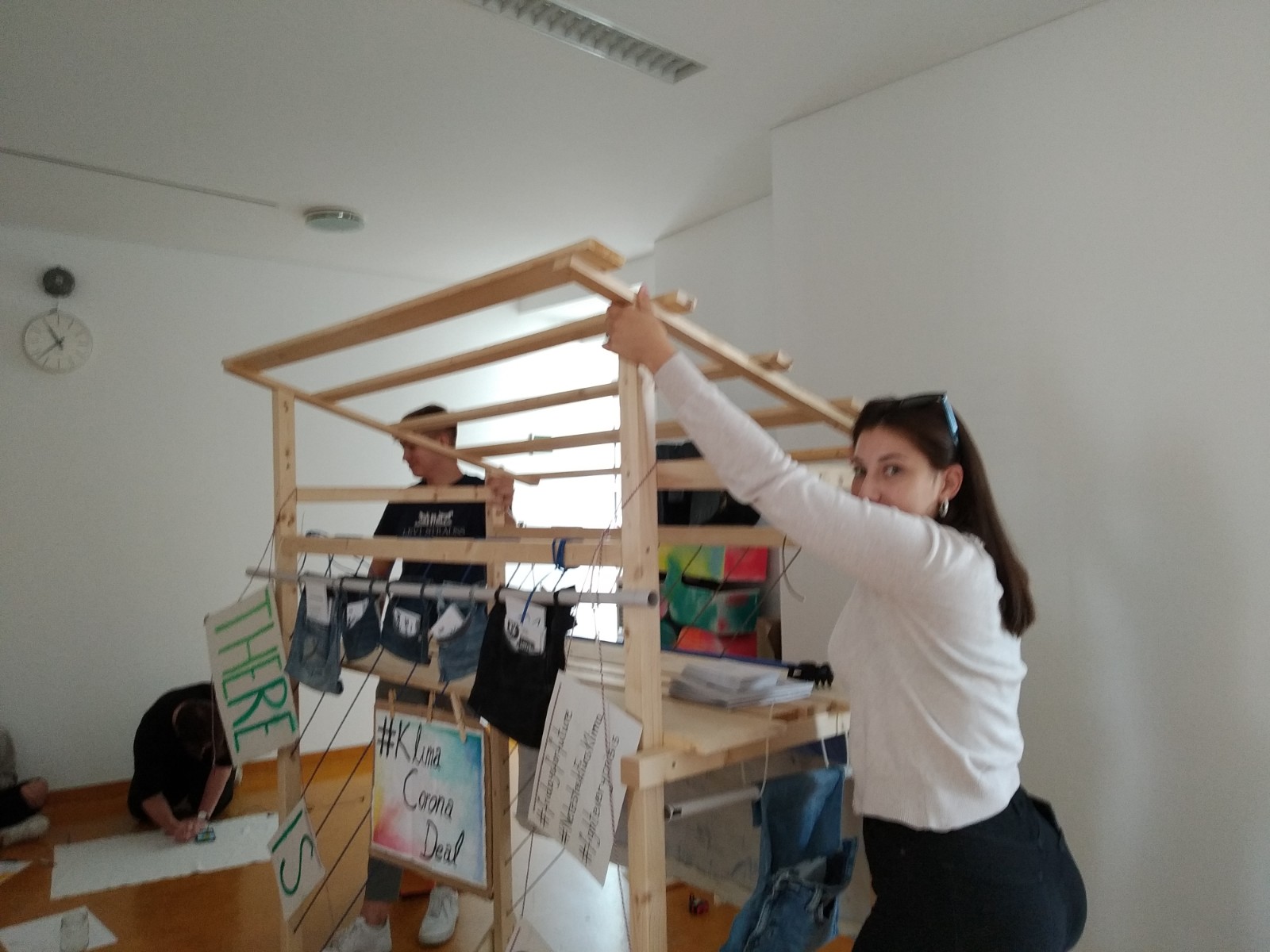 Mit den Social Designer*innen Christina Schraml und Martin Färber von der Angewandten begannen wir dann konkret an einem damals noch eher undefinierten Tool zu arbeiten, das uns helfen sollte, unsere Anliegen für Klimaschutz im öffentlichen Raum sichtbar zu machen. Das Projekt begann mit der Diskussion von den Möglichkeiten Jugendlicher im öffentlichen Raum und der Rolle des öffentlichen Raums in sozialen Veränderungsprozessen. Die Schüler*innen entwickelten Aktionen, Ideen und Prototypen für das öffentliche Umfeld der Schule. Wichtig war dabei, inspiriert durch die künstlerische Praxis des Urban Hackings, bereits bestehende Ressourcen zu nutzen bzw. zu adaptieren. Einige kleine, temporäre Aktionen entstanden, die subversiv auf die Anliegen der Schüler*innen aufmerksam machten.